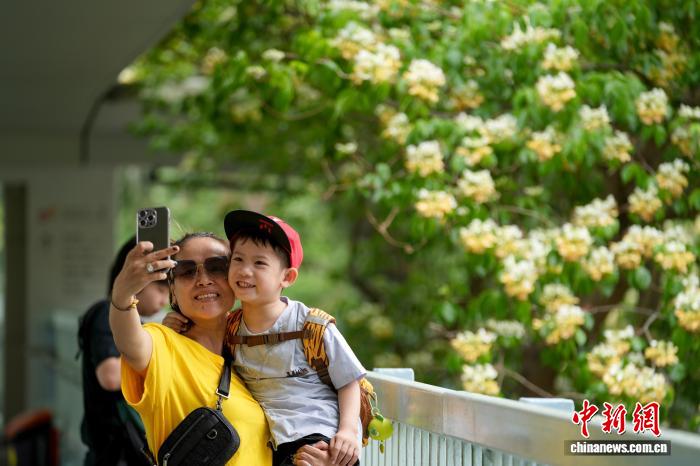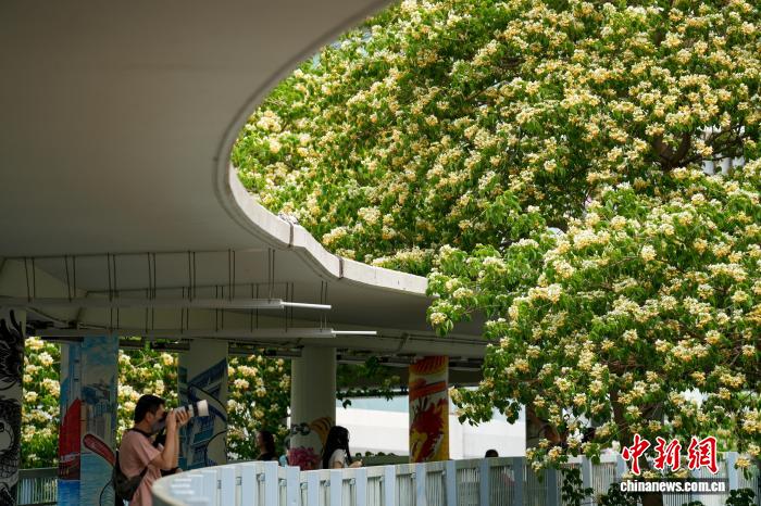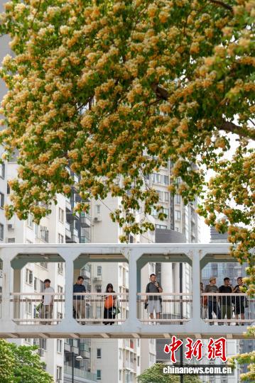 4月7日,喷鼻港旺角樱桃街旁的鱼木花竞相绽放,吸收市平易近立足浏览。记者 弛祥毅 摄